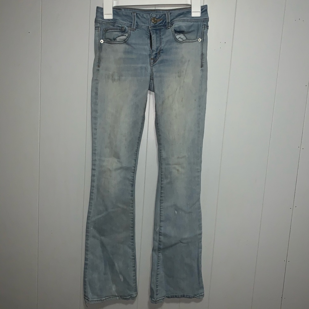 American Eagle kick boot jeans. Some bleach staining on the lower legs