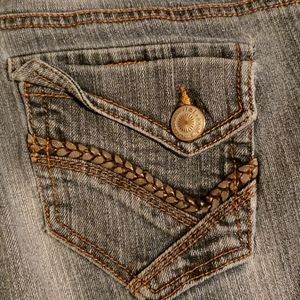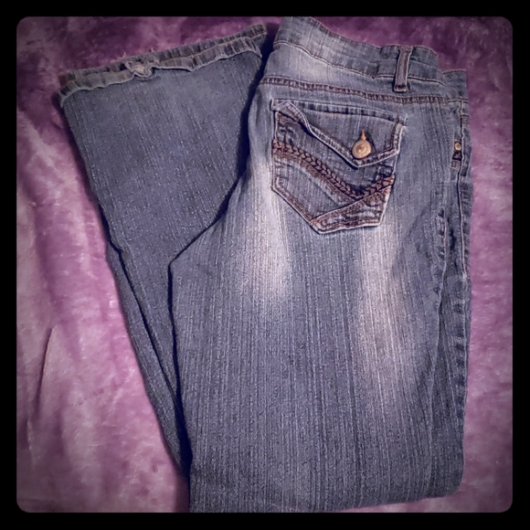 These do have some wear on the bottoms but it doesn't look bad. Still in very good condition. The tag says flare but these are more of a boot cut
