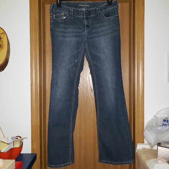 Maurices blue jeans, stretch material great fit, low rise regular straight leg ( not skinny not boot cut) barely worn but does have a snag on the from right leg near the inner thigh.