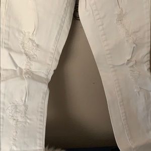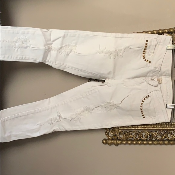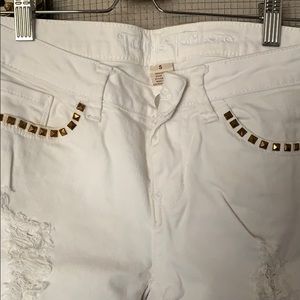White jeans with holes, gold studs around front pockets