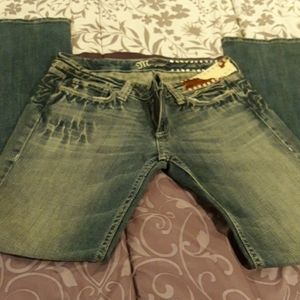 Excellent condition I wore once, like new, Miss Me Jean's size 9, semi wide leg, zipper and button front, 2 front pockets, above one front pocket, has a cow like and stud design, 2 back pockets, one pocket cowpoke design, with small Miss Me logo in silver other back pocket brown embroidered design, has the faded look, these are awesome. Woohoo.