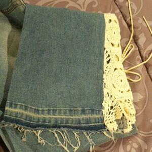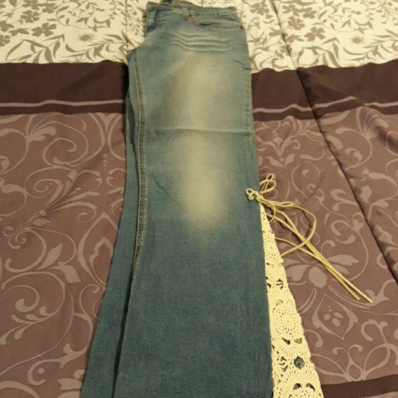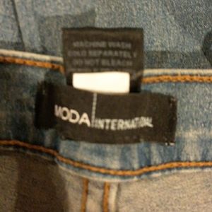 Really cute MODA INTERNATIONAL FADED STYLE JEAN'S, size 8, 2 front pockets, zipper and button front closure, frayed legs, creme embroidery oneack leg with creme ties. Very cute. Woohoo.
