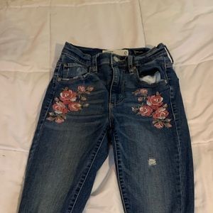 Super cute embroidered jeans from Garage. The waist band is slightly warped but it isn’t noticeable at all once on. Other than that it’s in good condition. Size 0 but can fit a size 23-25. Last photo shows how the jeans fit