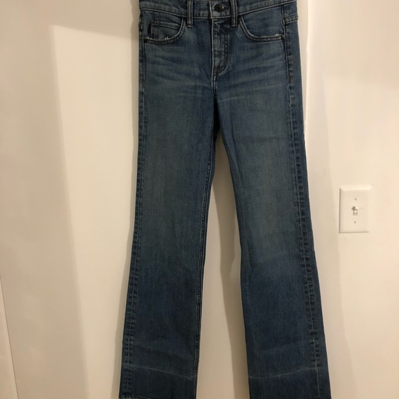 Straight flare jeans from Helmut Lang, medium wash, low rise, black button, never worn