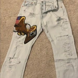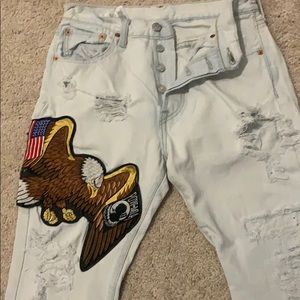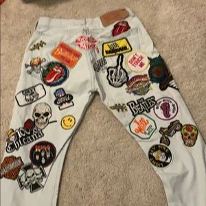 Levi jeans Redone with patches all over the back and on the leg says it’s a 29 waist but much closer to a size women’s 26 I wear a 25 and they fit me tight a little loose in the waste but just a littel Cut at the bottom to fit right to your ankle