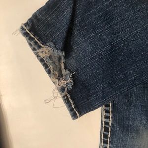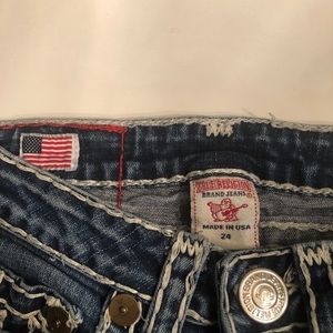 True religion jeans size 24. More of a low/mid rise fit. Some wear on the bottom back seams as shown.