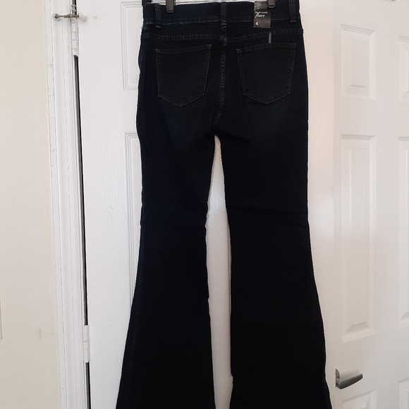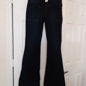High waist Dark Blue flare, large outside pockets with faux zipper and two gold buttons on side at waist.
