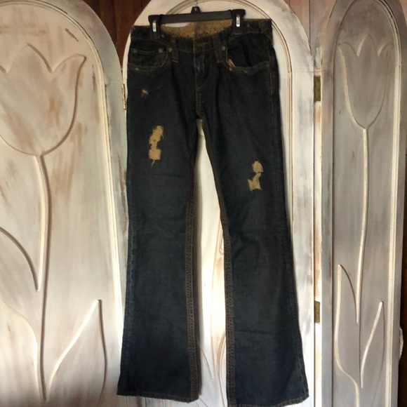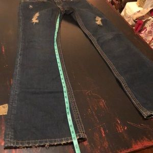Stitches brand women’s flare leg distressed dark denim jeans in excellent used condition.
