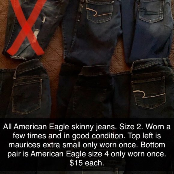 5 pairs of American Eagle Jeans. All size 2. They have only been worn once or twice and in great condition. $15 each