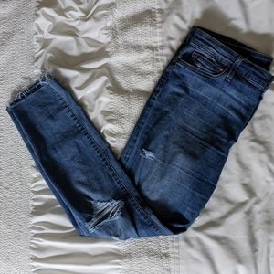 Holes in both knees and thighs. Soft&stretchy 31W (didn't have this as an option when selecting size)