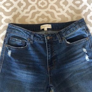 Blue jeans, mid rise, skinny, zipper fly, two front pockets, two back pockets