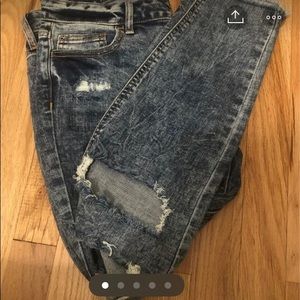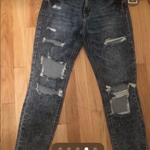 Dark wash , major distressing, frayed bottoms. Size 7