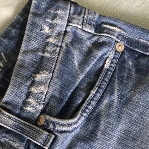 Gently worn. Have two pairs, same size. The imperfections around front pockets and waist, are factory (meant to be this way). No stains and no holes. I wish they still fit. I loved them so much, which is why there are two pairs! Price is for EACH PAIR