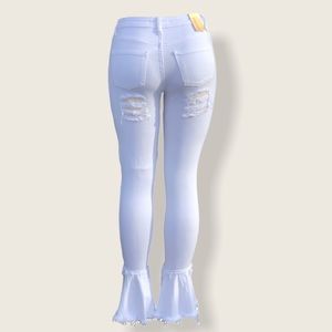 Distressed white jeans with bell bottom.
