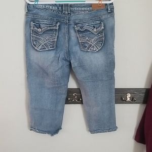 Rue21 curvy fit cropped jeans. Size 13/14. Frayed cuffed bottoms and destroyed look. Flap button back pockets. 9 inch rise, 17 inch inseam. EUC. Worn a handful of times.