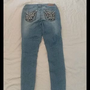 Skinny blue jeans butterfly on back pocket knee are a little worn size 3