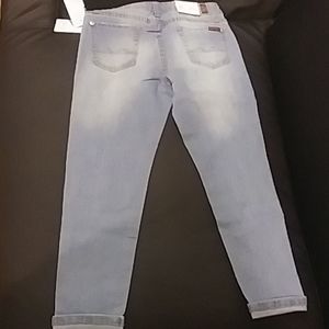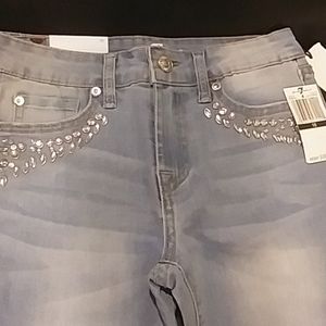 Light blue jeans with diamond jewels on front pockets. With cuts on pant legs.