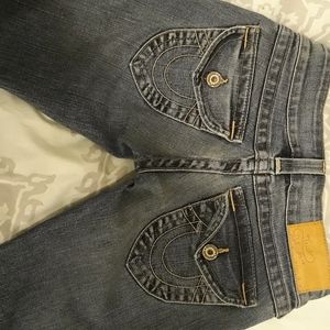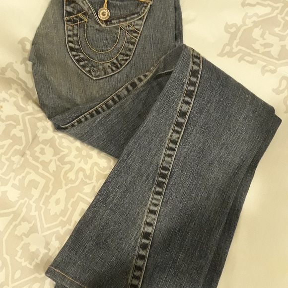 True religion pair of blue jeans, with cute pocket on bum that give it volume, has design curve at flared bottom. Excellent condition, as was worn few times only.