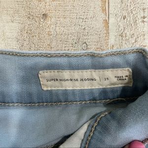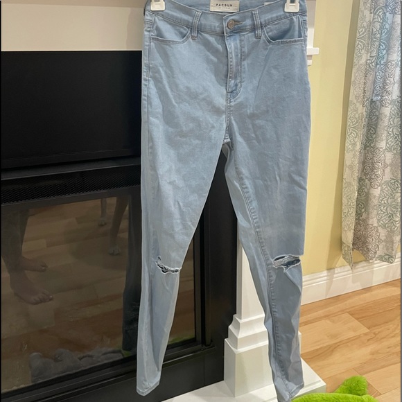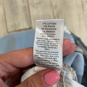 Light wash jeans. Holes at the knees and below. Really comfy. Has only been worn a few times