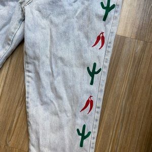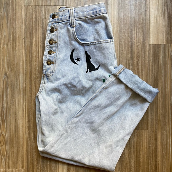 Super cute personalized jeans size 15/16 (fit more like a 30”) from depop so cute I love them but unfortunately they do not fit me so I have never worn them. Very canyon moon Harry styles vibes.