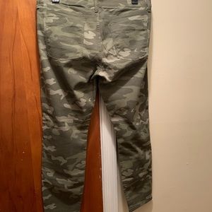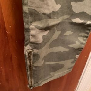 Camouflage jeans with 28” inseam and 32” waist (14). Skinny jeans with ankle zippers. 98% cotton and 2% spandex.