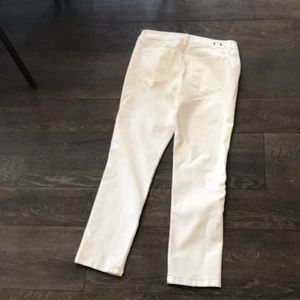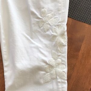 Gorgeous detailed Cabi white jeans, Slim Boyfriend cut with 30” inseam, copper button & rivets, like new. Subtle Flower details on legs & has pockets in front and back