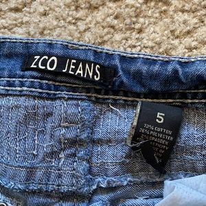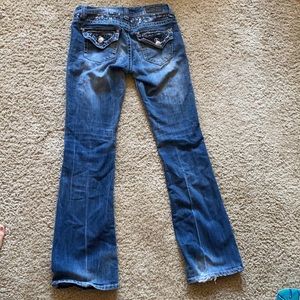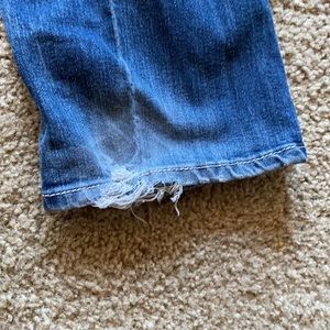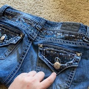 Jeans that were worn a great amount. Sequins on back pockets and around the waist. Tears by the feet.