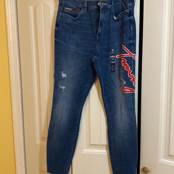Tommy Hilfiger high rise curve leggings they are brand new never worn in a size 14 regular length with a little distressed in the front of the jeans you can pair with sandals flats or cute tennis shoes