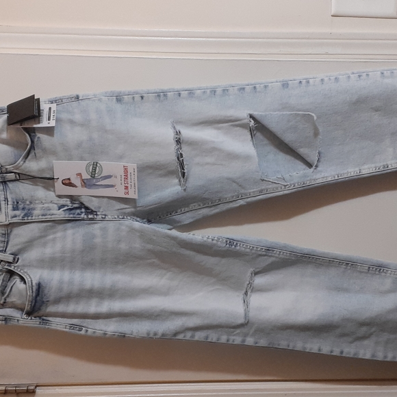 Distressed 5 pocket high rise slim straight Jean's. Length is 37", inseam is 26" and waist is 15".