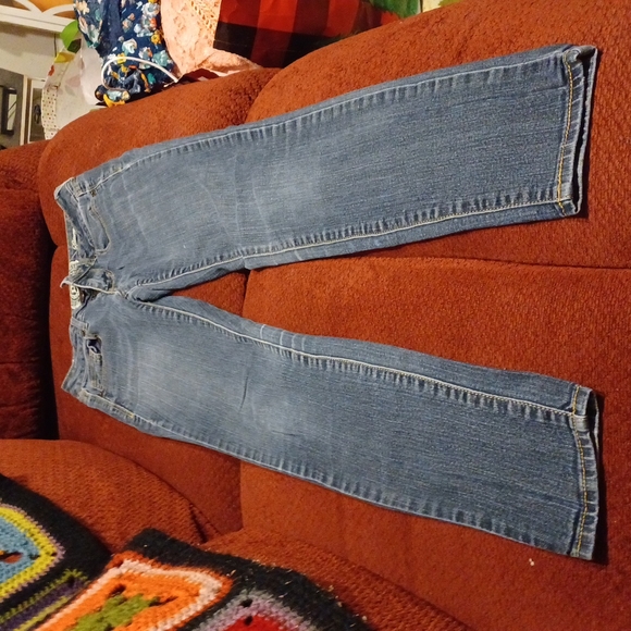 light blue denim jeans 5 pocket straight leg jeans with embrodered design on back pockets