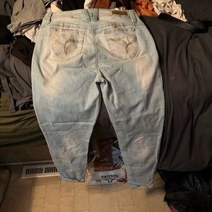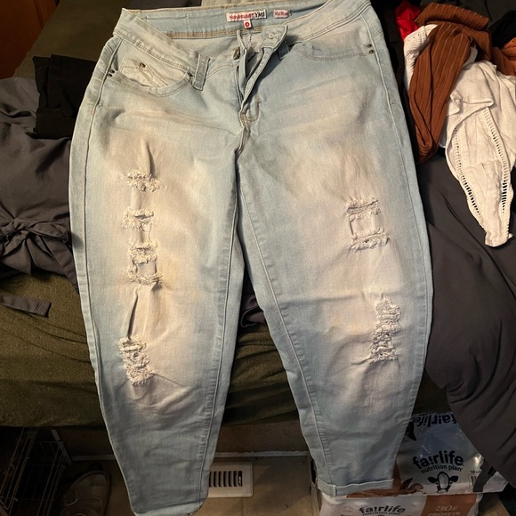Super cute light washed jeans. Have holes. Brand is wannabettabutt mid rise. They always were high rise more on me. They’re size 11. It wasn’t an option on selecting