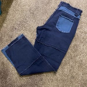 Patch Work Pants | Navy & Light Blue color | Low Cut (Waist Height) | Distressed at seams , Waistband, bottom, and Pockets | Was thrifted | Size S/M