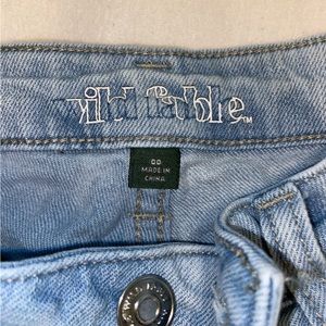 straight jeans, ridged at ends, fitting around waist