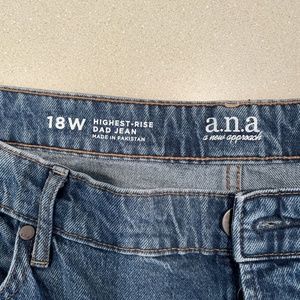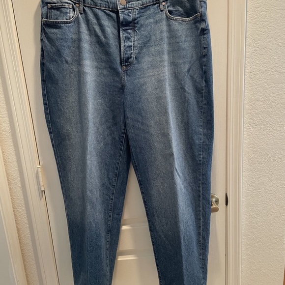 Button-fly jeans, size 18W, full legs, 99% cotton/1% elastane. I am 5'10" and these jeans are plenty long but not saggy at the bottom. Very comfortable. Highest-rise. Only worn twice. Smoke-free home.