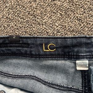 Size 2 LC dark wash jeans. No longer fits. Low rise, 7 1/2 inch. 84% cotton, 14% polyester, 2% spandex. Stretchy material. Skinny fit but not tight, 27 inch inseam. In closet, I have two more different washes of color, same style.