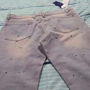 light blue jeans rips and black paint splattered down the front and back size 34×32 slim straight fit light tint down the front and back of the jeans