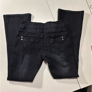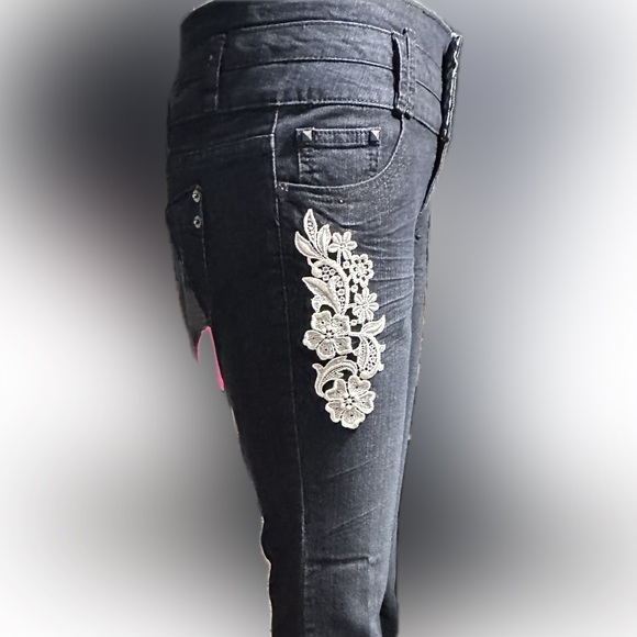 Jeans with Appliqué design flower that is a cream to white color