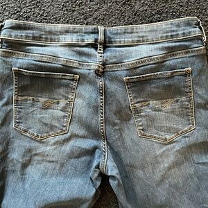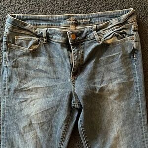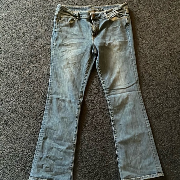These blue jeans (look more white washed in pictures then actually is) are more fitted in the thigh area then flare (boot cut) at the bottom. They are called curvy bootcut