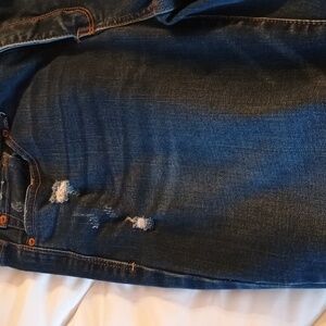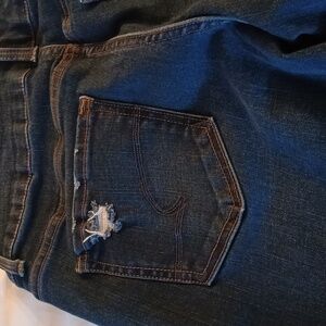 70% cotton 28% polyester 2% spandex size 14 35 in waist 17 in hips 21 in long and waist to ankle two functioning buttons zipper fly two functioning pockets on the front slight distressing two functioning pockets on the back small cuff