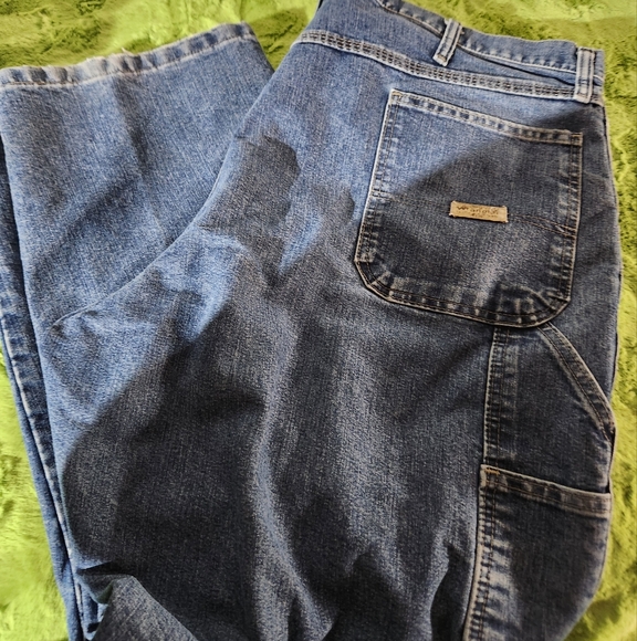 Men's carpenter style jeans 68% cotton 32% poly. With a 30" inseam.