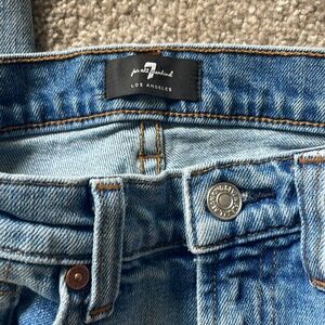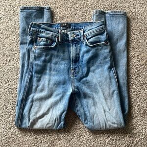 7 for all mankind women’s high waist cropped straight jeans. They are size 26 and good condition. In one of the pictures you can see by the ankle the thread is really white. Hard to see when wearing and I think a fault in the jeans! Inseam around 26 inches.