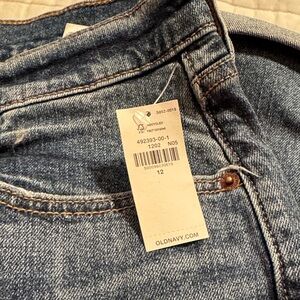 Brand new with tags Old Navy jeans size 12. Mid-rise boyfriend, regular inseam. Distress and rolled hem (but can unroll). Smoke free pet friendly home.