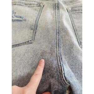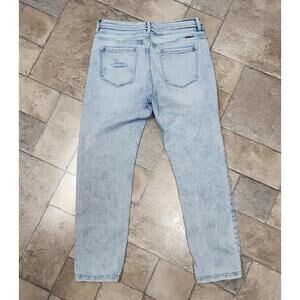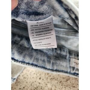 Size 15/31. Lots of stretch. Does have a mark on the bottom of back pocket. Haven't tried to treat it.