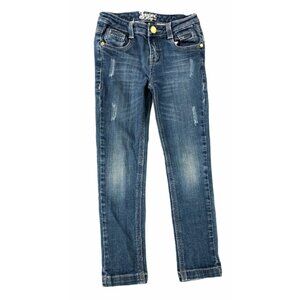 Perfect for a stylish, casual look, these size 7, blue distressed jeans for teens or women feature a medium wash, pockets, and a straight leg design. The low rise cut and slimming fit make these jeans a comfortable and fashionable choice.