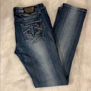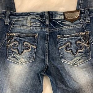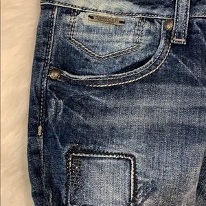 Distressed with embellished pockets & patching on leg. Great quality jeans. These are rocking!