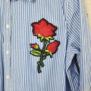 Jeans by Buffalo Striped Sequin Floral Button-Down Shirt Blue Red & White.