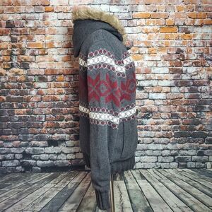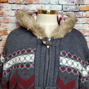 This is a new with tags I. Jeans by Buffalo thick sweater jacket with quilted lining and hood with faux fur. Has zipper with toggle buttons. Can be unisex but please read ALL measurements carefully. Measurements are apx.