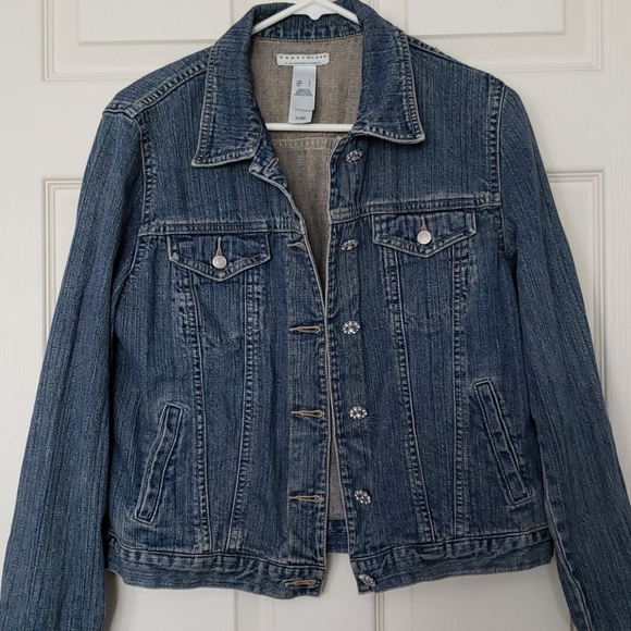 Woman's jeans jacket with rhinestone buttons. 2 front pockets and 2 bottom faux pockets. EUC. Crazyhorse by Liz Claiborne.