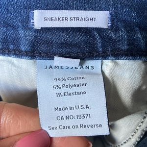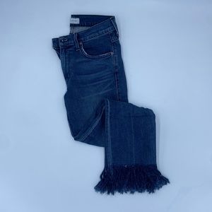 Like new/Great condition - blue denim jeans with fringe distress at the bottom of the pants. High waisted “sneaker straight”