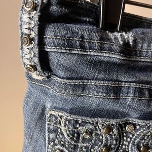 Rhinestone embellished pockets inseam, 20 inch rise 7 inch